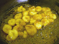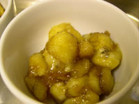 Heat the butter over a high heat in a frying pan and when melted add the brown sugar. This will form a kind of toffee in the bottom of the pan. Add the chopped bananas and then the sake and then simmer the mixture until the bananas are soft and most of the sake has been evaporated. | ![]() |