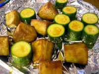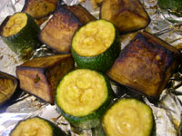 | Next cut the aubergine into cubes and the courgette into thick slices. Dip them in the bbq sauce and place them on a baking tray. | ![]() |