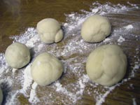 make sure they as thin as you can get them. A little trick for getting good circles is to make 1 roll of the rolling pin over the ball of dough and then turn the dough around clockwise one third. Roll again and turn one third again. Keep doing this and with a bit of practise you will achieve perfect circles. |