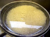 First of all you will need to wash the rice. Place it in a sieve in a container and run cold water over it. Sloosh it around every now and again with your fingertips in the water that collects in the container to remove some of the starch which appears as cloudiness in the water. Allow it to sit in the water for about 1 hour and then give it one final rinse. Allow it to drain in the sieve. | ![]() |