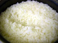 Next place the water into a medium sized pan. Make sure the pan you use has a tight fitting lid as you don't want too much steam to escape whilst the rice is cooking. If you don't have a tight fitting lid wrap a tea towel around the underside of the lid to help it create more of a seal. Bring the water to the boil and add the rice. Bring it back to the boil, turn the heat down, and put on the lid. Set the timer for exactly ten minutes and allow the rice to boil slowly. Remember don't peek thats why the timer is set. After the ten minutes is up turn the heat off, leave the lid on, and set the timer for another ten minutes. The rice will now steam in it's own heat and puff up a little. |