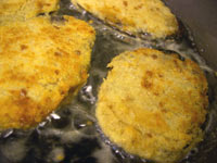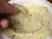 bowl. Finally place the breadcrumbs in another bowl. (There are some notes on Japanese breadcrumbs and tips on making your own breadcrumbs in the glossary) Dip each katsu in the flour first, then the egg mixture and then the breadcrumbs. Flatten each katsu together with the palm of your hand to seal them well and allow them to sit on a tray for couple of hours to dry a little. |