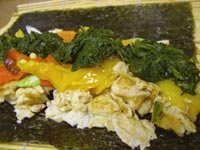 Lay a sheet of nori seaweed onto your sushi mat. lay on your leftover omelette and pile in your leftover vegetables. Squeeze in a little wasabi paste and roll it up. If the nori seaweed doesn't seal just wet it a little by dipping your fingers in water and dabbing them on the nori. If you haven't messed up any omelettes because you have mastered the technique it is likely you may have a little omelette batter left in your bowl. Just cook it off quickly in a pan and use that. |