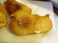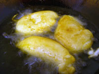 | Bring a deep fat fryer or a pan of oil (Be careful!!) to a temperature of about 180°C (356°F). Dip the slices of mango into the batter and fry them both sides. | ![]() |