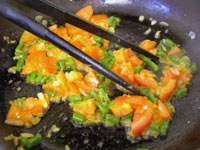 Finely chop the onion and the french beans if you are using them. Heat the butter in a frying pan and fry the onions and beans for about five minutes over a medium heat until soft. Add the tomatoes and cook for another couple of minutes. | ![]() |
