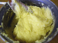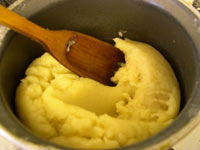 | Turn down the heat and quickly add the flour and beat it vigorously so that the flour becomes incorporated into the mixture. Don't stop util this has happened. If all is well the resulting 'dough' should easily come away from the sides of the pan. Take off the heat and allow it to cool for 20 minutes. | ![]() |