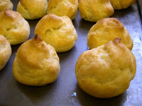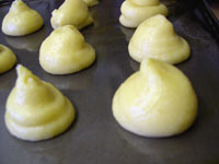 | Pipe the choux pastry onto a baking sheet so that they are just smaller than the size of a golf ball. If you don't have a piping bag use a freezer / storage bag. Just fill it up, squeeze all of the mixture to one corner, and snip off the corner with scissors. Instant piping bag. | ![]() |