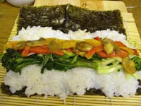 have some warm water standing by to rinse your fingers. Place you fillngs on the rice and get ready to roll. If you want to simplify this sushi just use fewer fillings. |