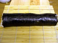 | Square off the sushi by pushing down on the sushi as well as pinching the sides. The mat will more or less do this for you. The picture illustrates clearly how it should look. | ![]() |
