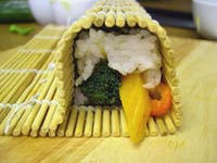 | Roll the sushi with the mat trying to keep the fillings together and in the centre with your fingertips as best you can. | ![]() |