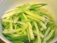First of all prepare your mushrooms, peppers and sweet potato. Bring a pan of water to the boil, season with plenty of salt and cook the broccoli for 4 minutes. Cool under cold running water and drain. Make a cucumber pickle by cutting the cucumber into thin strips and mixing it with the rice vinegar, sugar and salt. |