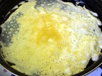 | 3. Push the roll of omelette to the furthest end of the pan way from you, add a little more oil and add one more third of the egg mix to and cook. Add more nori if you wish to. Keep cooking over a medium heat until the omelette is cooked through and roll the existing roll over the 'new' omelette so they are rolled together. | ![]() |