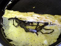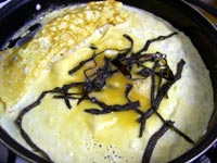 | 2. Wait until the egg is just cooked through, sprinkle with a little shredded nori if you are using it, and start to carefully roll it up. The Japanese would use chopsticks to do this but use whatever you would normally use to make a pancake. Make sure you release the omelette from the sides with a knife before you start to roll. | ![]() |