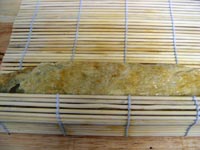 | Allow the egg roll to cool slightly and then slice it up and serve it if you want to eat it straight away. If you want to present it nicely place the slightly cooled egg roll on a sushi mat and shape it as I have done in the picture. You can make it round or square shaped in cross section. | ![]() |