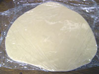 | Roll out the dough with a rolling pin to a thickness of about 5mm (3/16th of an inch). Lay it somewhere safe on your work surface where it will not be disturbed and cover it well with cling film and leave it for two hours. The cling film will prevent air moisture being absorbed into dough. | ![]() |