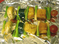 Yakitori is usually pieces of chicken skewered on sticks and grilled. I have substituted vegetables and a chewy Cyprus cheese for the chicken but all of the other ingredients are as they should be. Use any