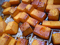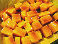 | Next cut the sweet potato into largish cubes and place them on a baking tray. Brush them with vegetable oil and spoon over some of the yakitori sauce. | ![]() |